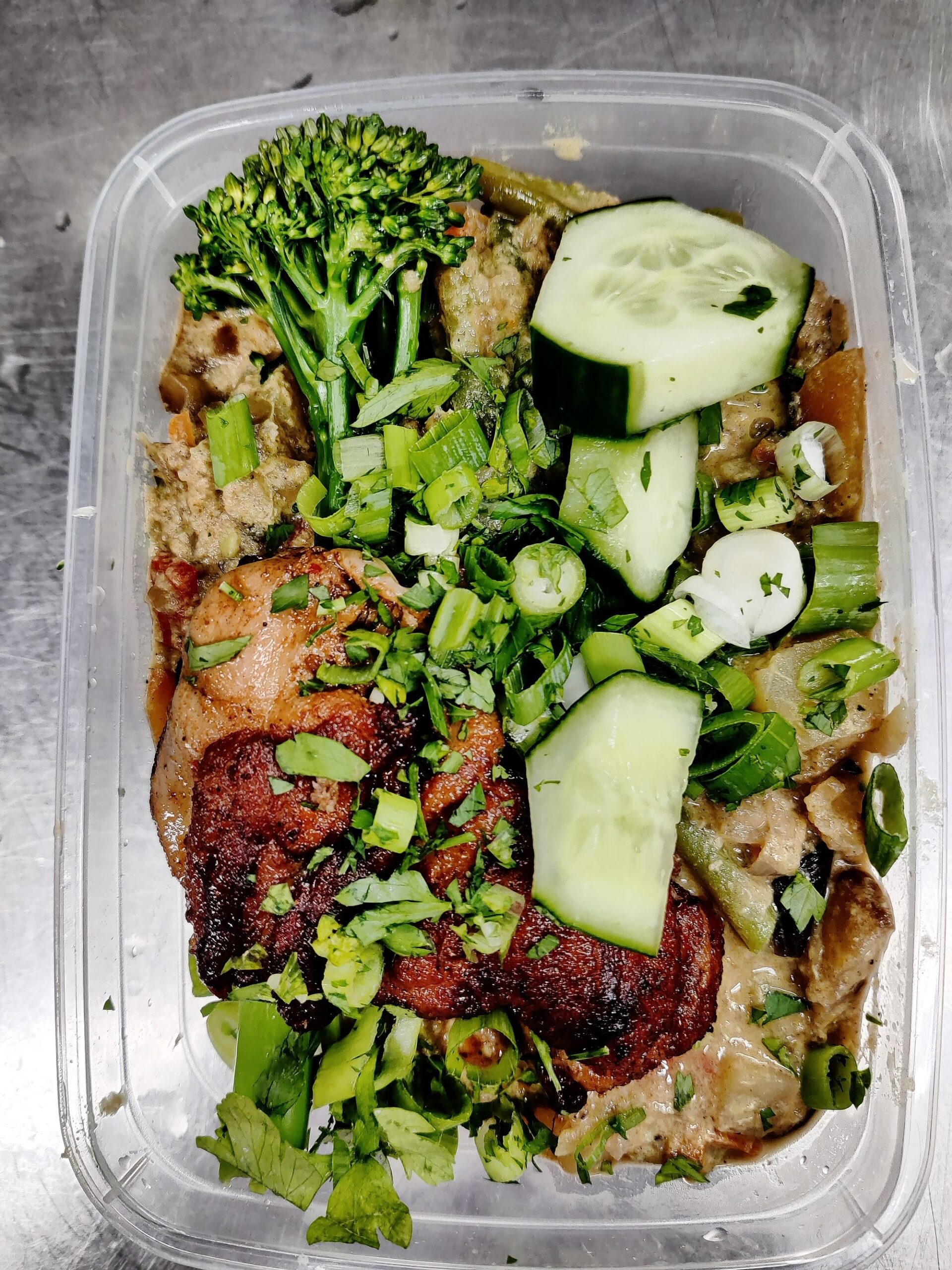De rijst (3 kilo) werd gekookt, alle groenten gesneden en gebakken en de kip aangezet in de pan voor een mooi kleurtje en daarna in de oven om na te garen.