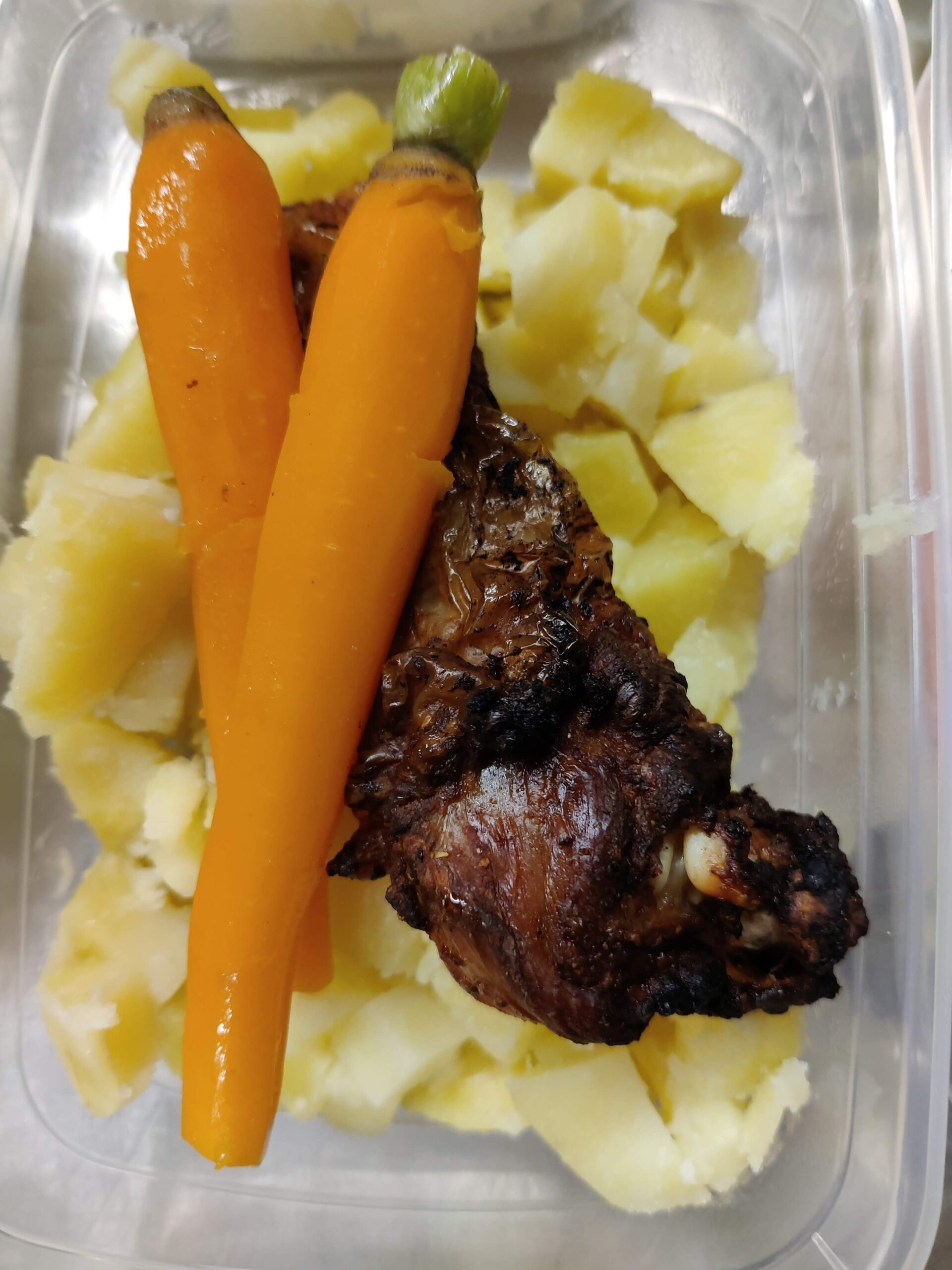 Gelukkig stonden de kippenpoten al klaar, terwijl we de bakjes vulden met aardappel en poot stoomden we nog snel de wortelen, dankzij de Rational lukte het om ondanks het bezoek nog redelijk op tijd klaar te zijn.