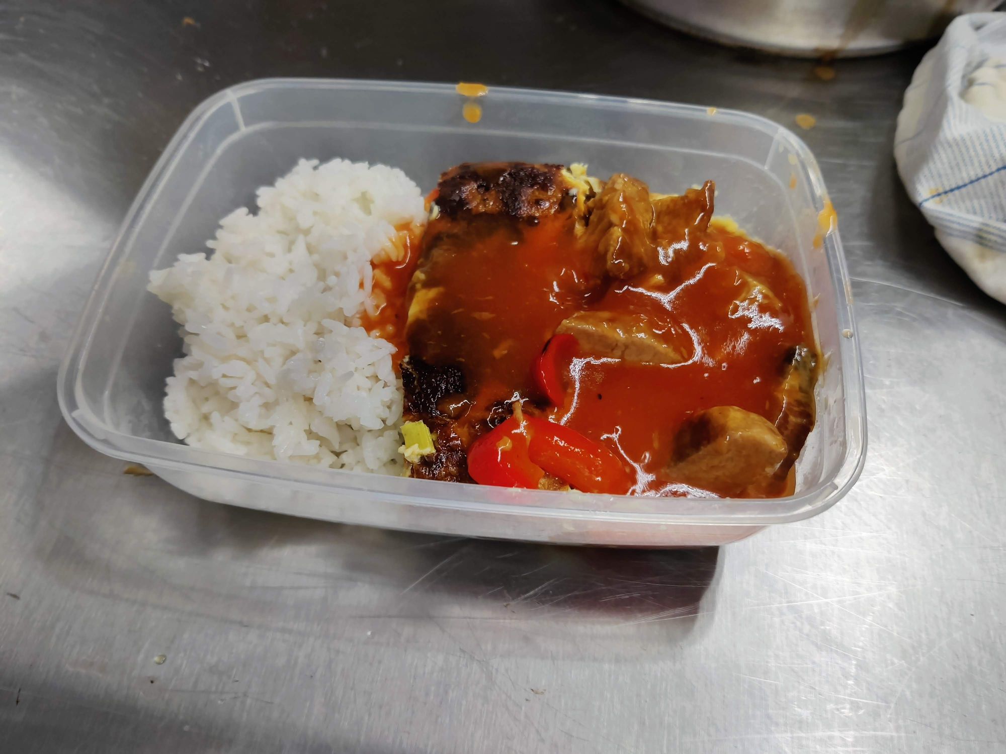 Geserveerd met een extra schep saus ging het naar onze deelnemers, volgende week zijn de nieuwsgierig naar de reacties. De kosten voor deze maaltijd waren 2,44 per deelnemer! De rijst en tomaten kwamen uit voorraad, de rest werd ingekocht.