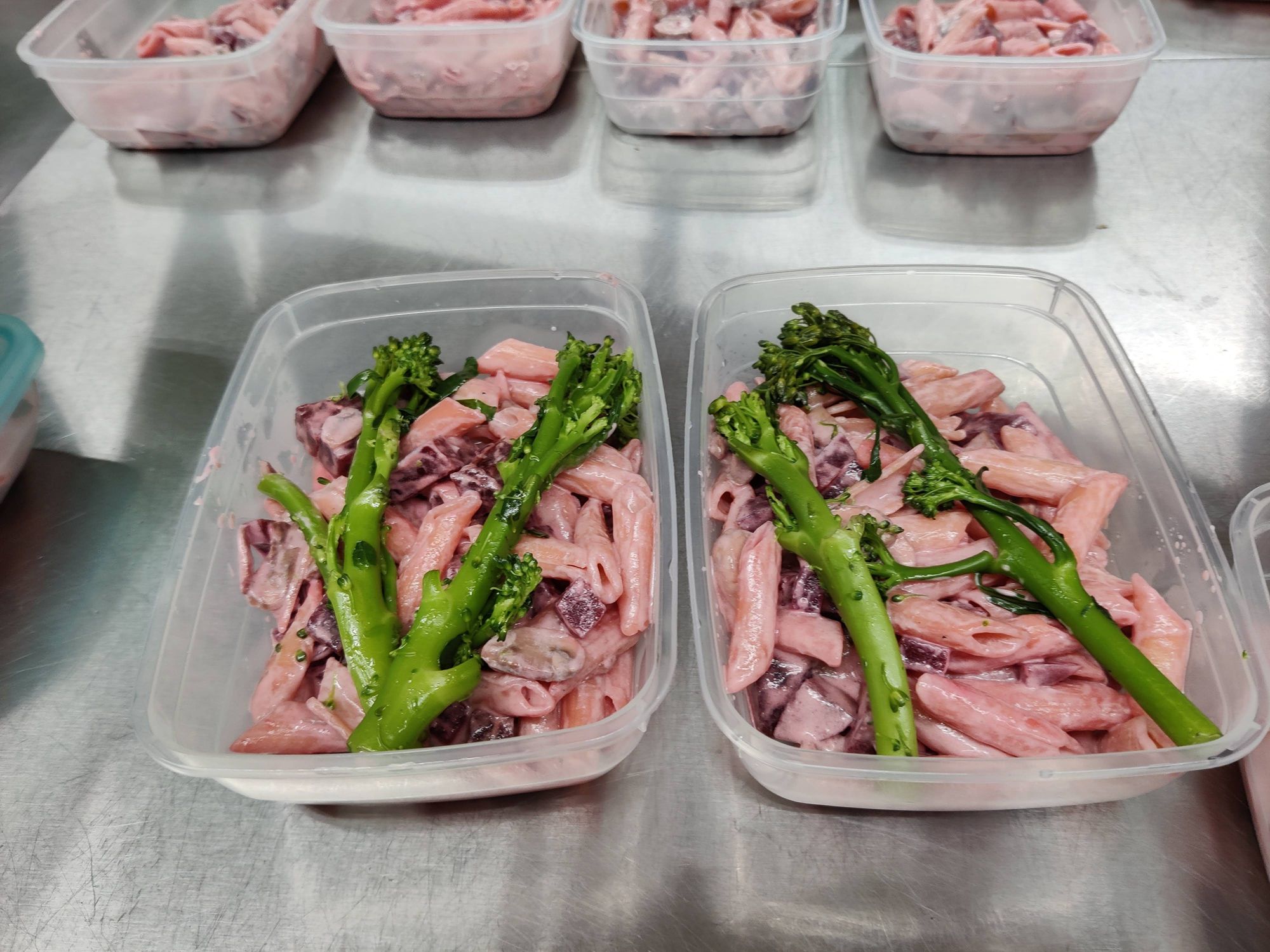 Terwijl ik het recept uit de doeken deed bij de keuken-vrijwilligers merkte Marius fijntjes op dat er en gluten en lactose in zat. Niet handig voor onze deelnemer met lactose- en glutenallergie. Maar gelukkig hebben we voorraden en met wat tomatensaus, groenten en quinoa maakte Marius een prachtig alternatief.