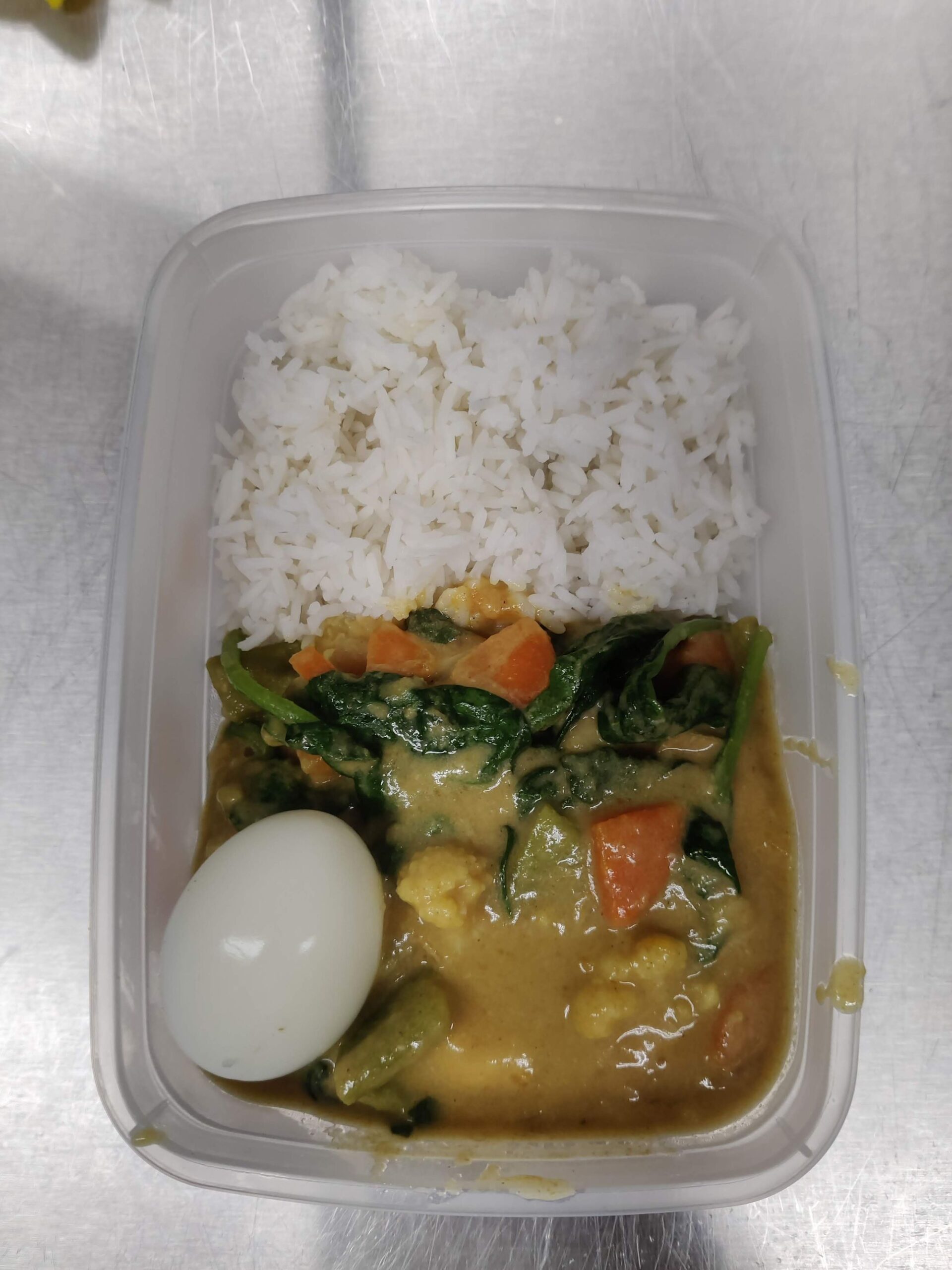 Witte rijst met groente curry; de groenten die we gebruikten: rettich, wortel, pompoen, snijboon, bloemkool en spinazie.