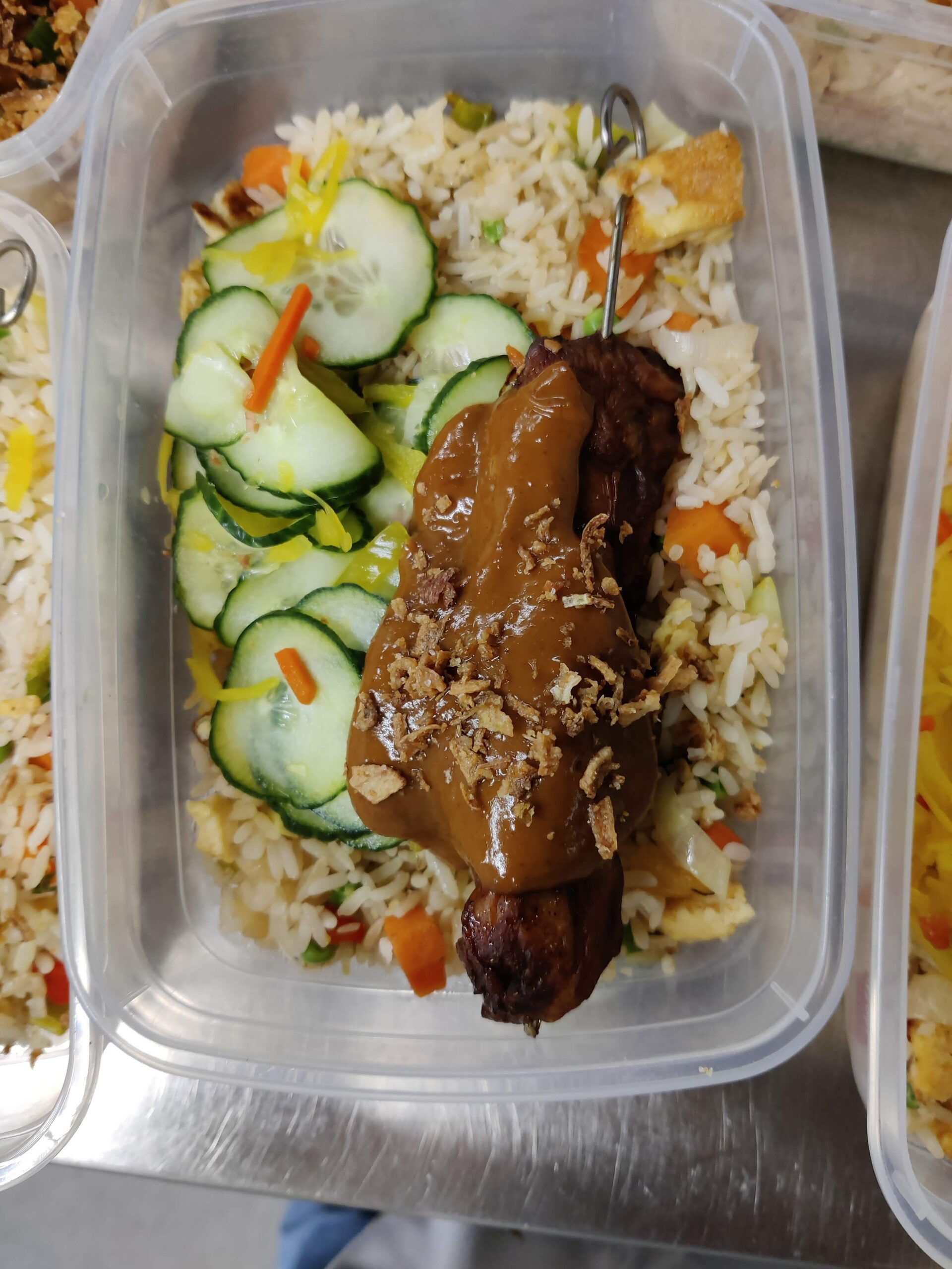 Dan als afwerking een stokje sate van de Lindenhoff, die waren overgebleven van de receptie van Tineke en met huisgemaakte pindasaus en gebakken uitjes was dat een waardige aankleding.