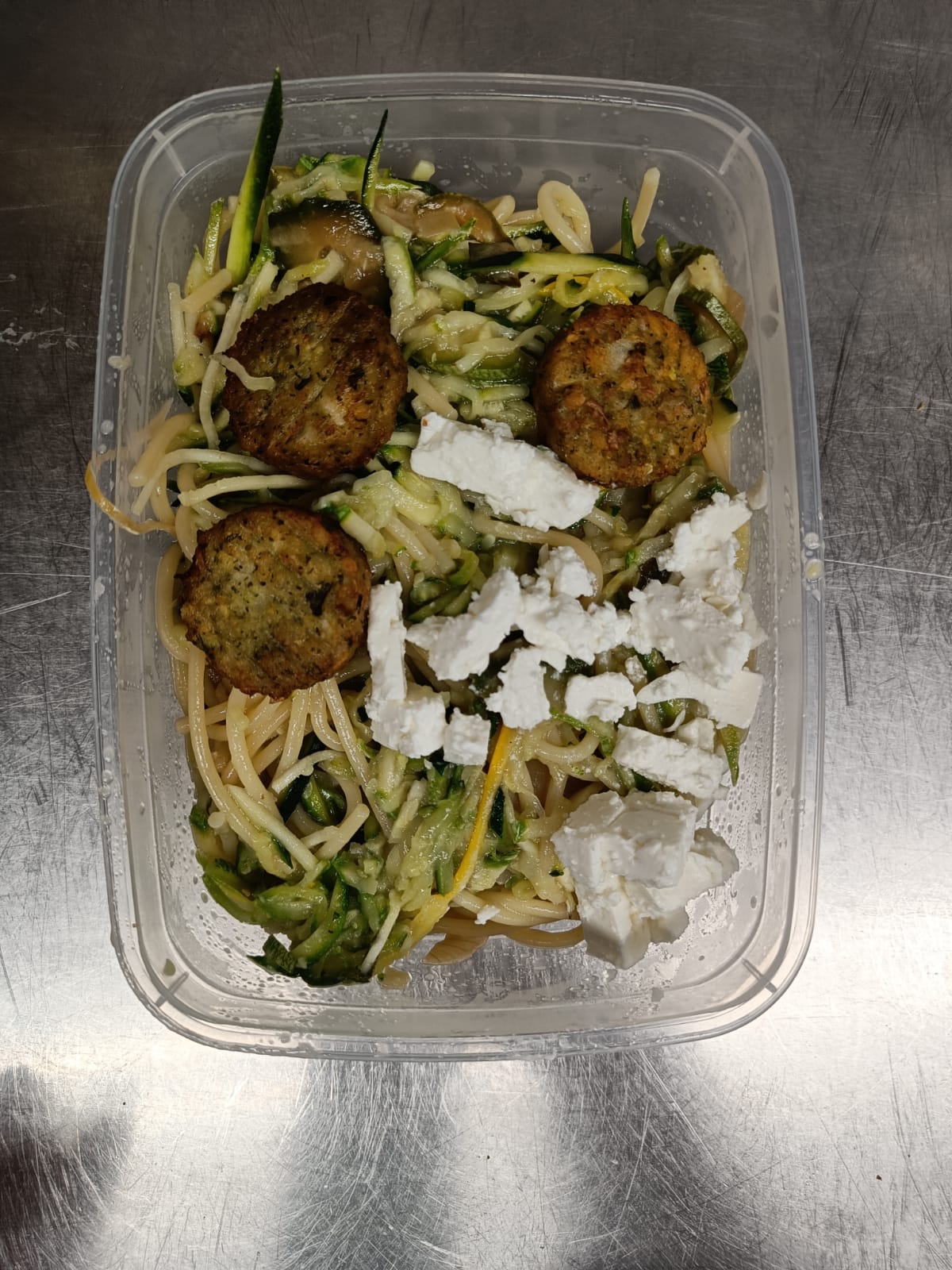 Bij de AH vonden we bij toeval vegetarische falafel gemaakt met feta en courgette, dat past er mooi bij. Even dacht ik nog aan een mootje zalm, in de aanbieding bij de Vomar, maar acht keer €7.89 is beduidend meer dan 8 keer €2.24 dus we gingen voor de vega-variant uit de industrie.