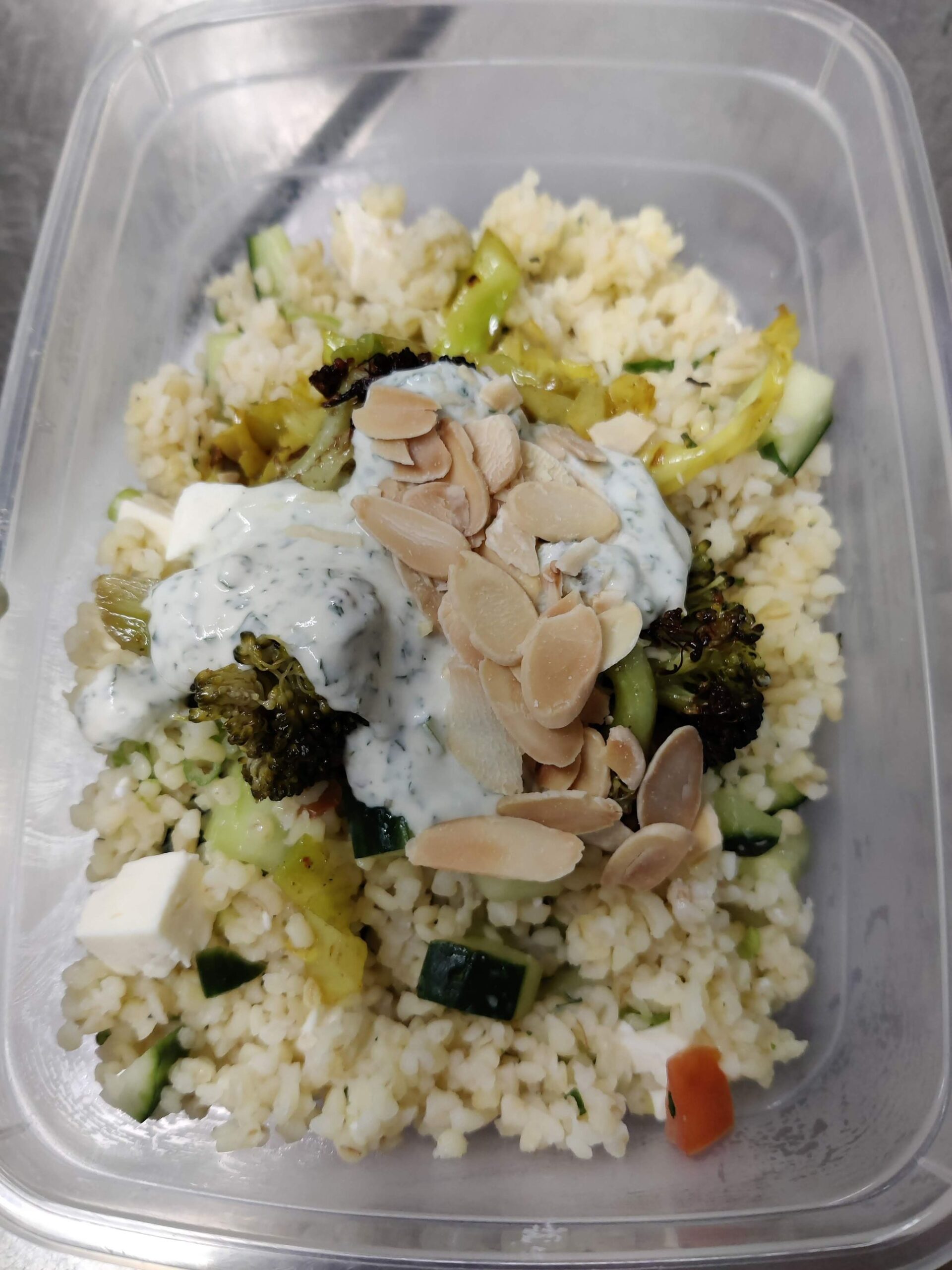 We mengden alle ingrediënten door de lauwwarme bulgur en zo ontstond de tabouleh, vervolgens de broccoli er op en de garnering in de vorm van de saus en het geroosterde amandelschaafsel.