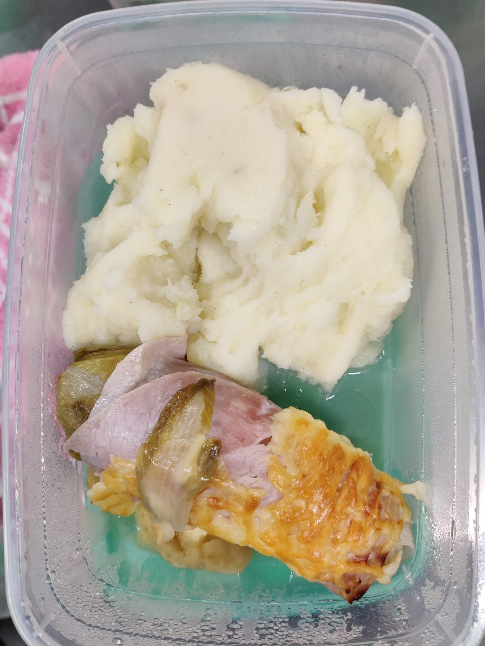 We stoomden de witlof bijna gaar terwijl we de aardappelen schilden, toen gingen de aardappelen er in en koelden de lofjes een beetje af zodat we ze konden inwikkelen.